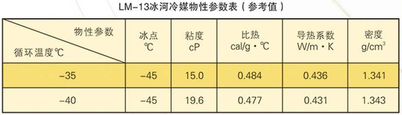 本品適用于低溫庫和速凍庫做間接制冷載冷劑使用。使用時先將系統(tǒng)清洗干凈,然后將本品直接加入系統(tǒng)使用,具體物性參數(shù)參考下表。