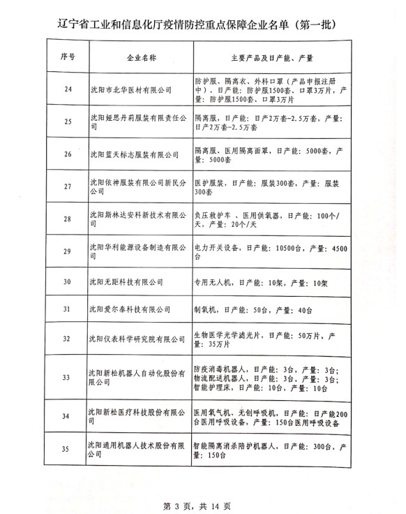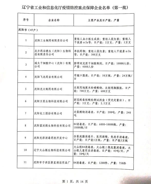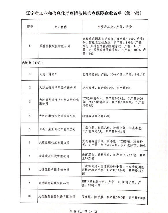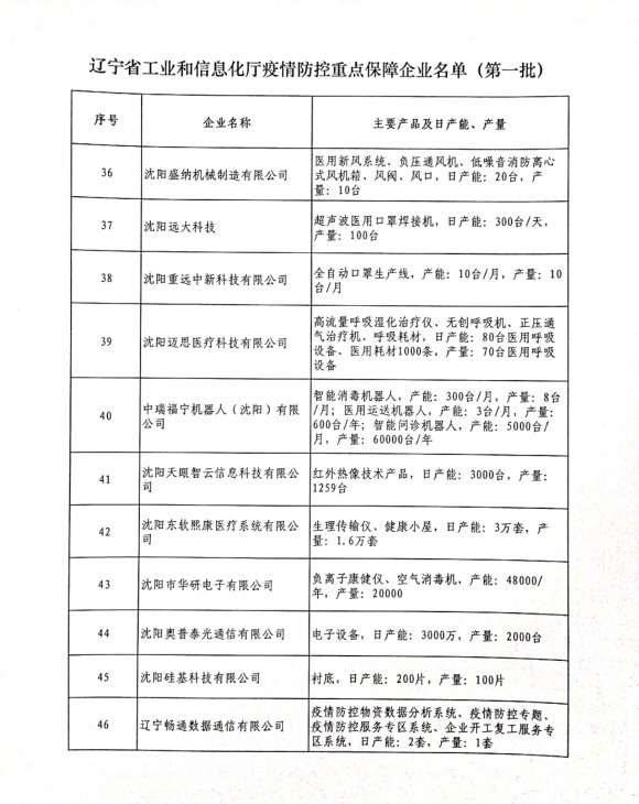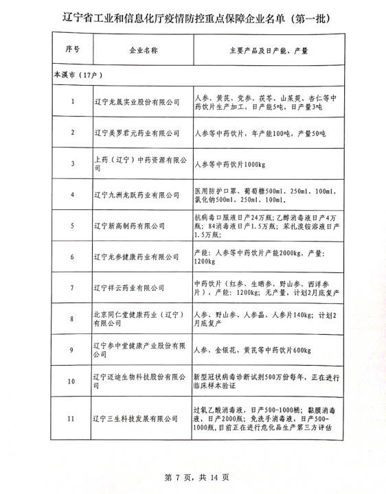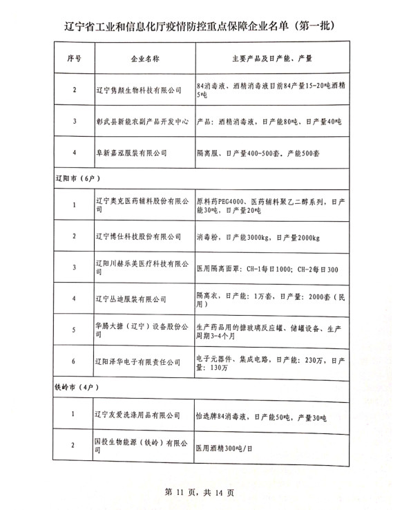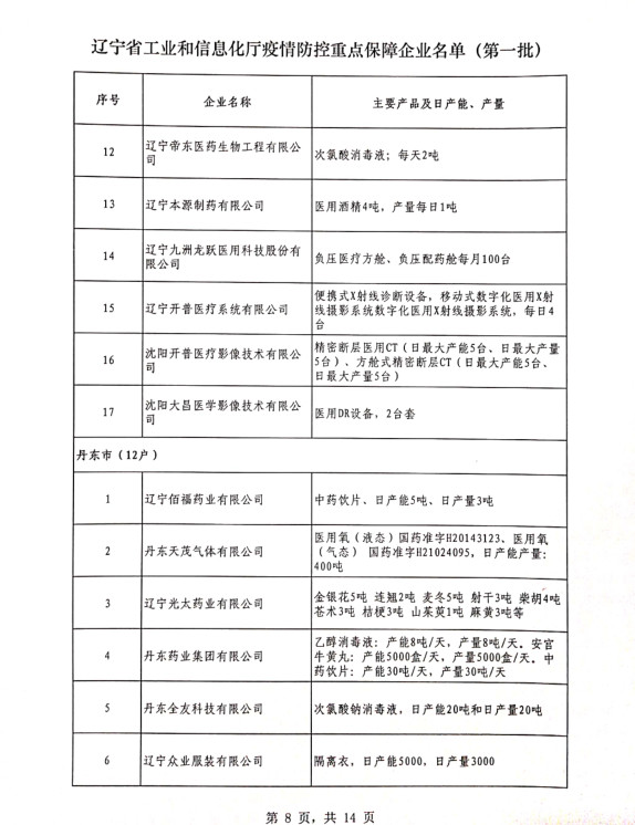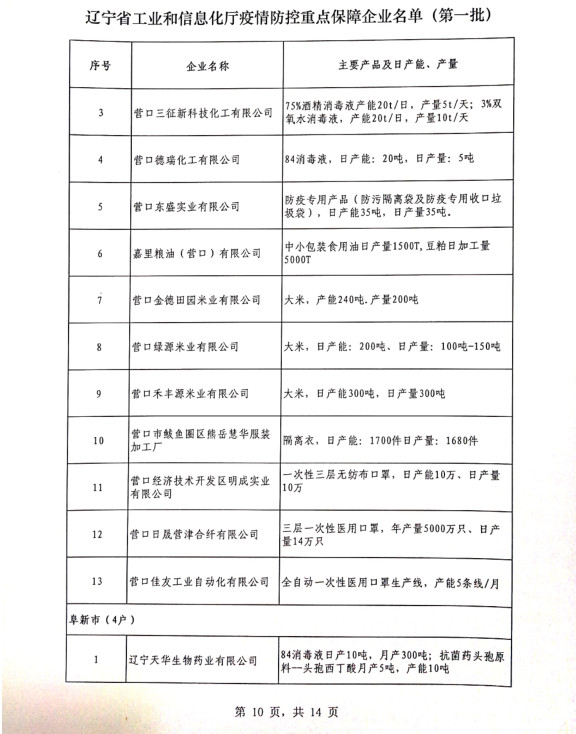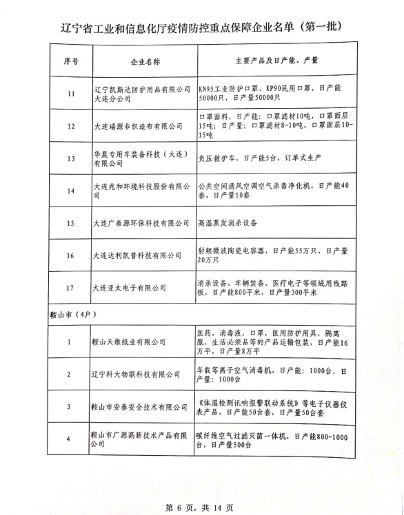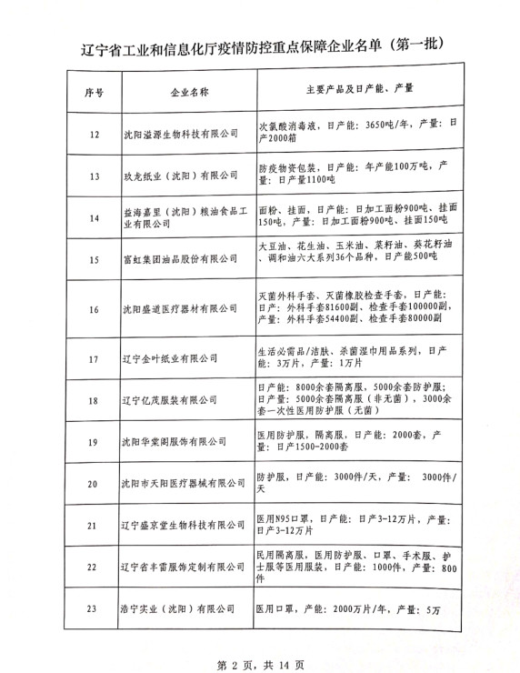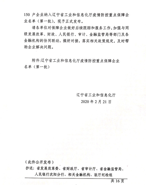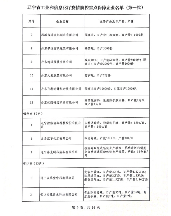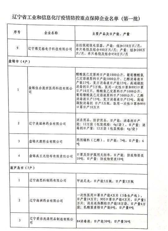 為貫徹落實(shí)習(xí)近平總書記關(guān)于疫情防控工作的重要講話和指示批示精神,落實(shí)黨中央、國(guó)務(wù)院和省委、省政府有關(guān)部署,按照《遼寧省人民政府關(guān)于印發(fā)遼寧省應(yīng)對(duì)新型冠狀病毒感染的肺炎疫情支持中小企業(yè)生產(chǎn)經(jīng)營(yíng)若干政策措施的通知》(遼政發(fā)【2020】6號(hào))和《遼寧省工業(yè)和信息化廳關(guān)于規(guī)范省級(jí)疫情防控重點(diǎn)保障企業(yè)名單管理有關(guān)事項(xiàng)的通知》(遼工信明電【2020】35號(hào))要求,在各市審核推薦的基礎(chǔ)上,經(jīng)我廳認(rèn)真研究,決定以下150戶企業(yè)納入遼寧省工業(yè)和信息化廳疫情防控重點(diǎn)保障企業(yè)名單(第一批)。